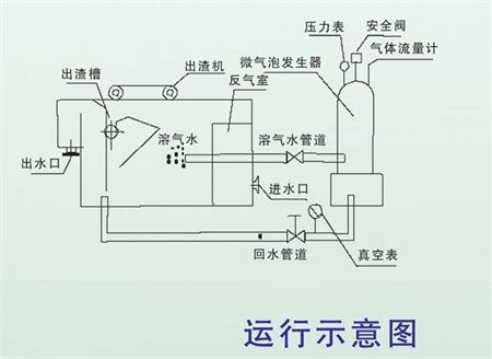 气浮机原理,经加药反应后的污水进入气浮的混合区,与释放后的溶气水混合接触,使絮凝体粘附在细微气泡上,然后进入气浮区。絮凝体在气浮力的作用下浮向水面形成浮渣,下层的清水经集水器流至清水池后,气浮池水面上的浮渣积聚到一定厚度以后,由刮沫机刮入气浮机污泥池后排出。