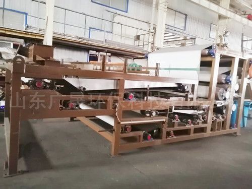 带式压榨机通过楔形区、低压区、中压区、高压区和强力对辊挤夹区将泥浆中的水份经过逐级增压的方式不断挤压出来,然后形成含水率较低的滤饼排出,通过刮料板刮离,上下滤带分开,经过高压冲洗水及滚刷清除滤网表面孔隙中的微量颗粒,继续进入下一步脱水循环。