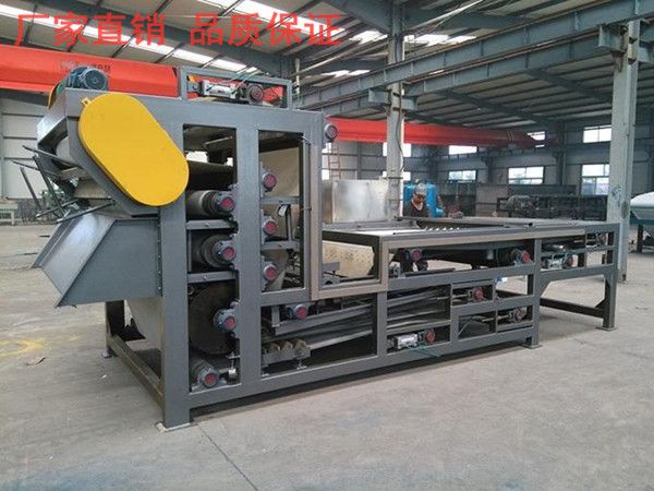 洗砂泥浆处理设备,经过絮凝的悬浮物料在重力脱水段脱去大部分游离水,物料逐渐得到进一步浓缩,然后通过翻转机构卸料至上下滤带之间,进入楔形区内进行预压脱水,经主脱水辊脱水后,进入系列S形排列的压辊压榨脱水直至形成滤饼后卸料。