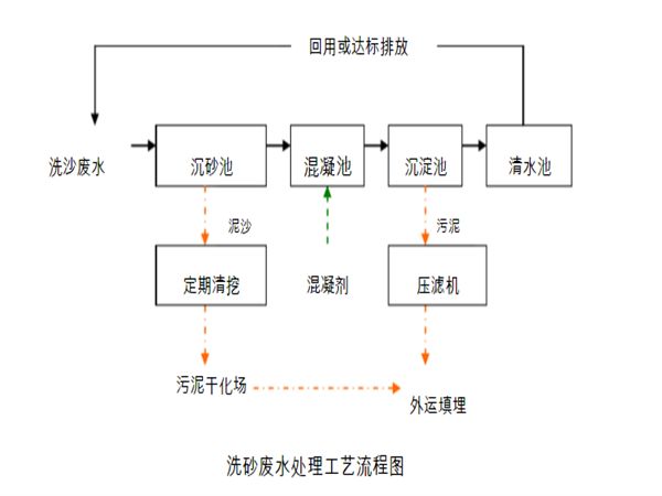 洗砂污水由排水系统收集后,进入集水调节池,进行均质均量,调节池设置液位控制器,再经液位控制仪传递信号,由提升泵经加药系统送至一沉池、二沉池进行沉淀,上清液流 入回用池回用,沉淀污泥由带式污泥压滤机脱水外运。