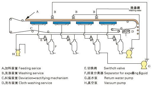 带式真空过滤机是一种自动化程度极高的新型过滤设备。该机以滤布为介质,浆料由加料器均布在向前移动的滤布上,在真空推动力的作用下,滤液穿过滤布和胶带吸引沟进入真空箱,再由真空箱的排液孔进入集液槽中回收或排放。滤布上的滤饼经多次洗涤、抽干,在滤布转向处进入卸料处理,完成卸料之后滤布通过滤布洗刷装置进行再生。之后滤布通过一系列滤布托辊、滤布纠偏装置,再通过进料端组件上滤布压辊,又重新覆盖在橡胶带之上进入给料段、过滤、洗涤和抽干段,其操作过程是完全连续的。