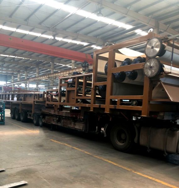 4.对夹挤压辊(或带)高压脱水区,污泥脱离中压区后就进入高压区,污泥在此区内受到1~3组对夹辊(或带)挤压,经过挤压后体积大幅收缩,污泥内的间隙游离水被充分挤出,此时,形成含固率较高的滤饼,分体式浓缩带式污泥脱水机特别适用大型矿山尾泥、大型洗砂场,石场制砂泥浆脱水、陶瓷原料泥浆、洗山砂、土包沙泥浆脱水、河道清淤等工业污泥深度脱水处理和大型污水厂的使用。