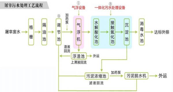 根据废水的特性和对水的处理要求,废水处理工艺需要采用物理化生化处理工艺. 废水的CODcr色度高,油浓度很高,油附着在生物膜的表面,造成废水和生物膜之间的接触被阻塞,因此生化去除效率减少废水中含有大量的畜毛,肉和骨头. 碎屑,内脏残渣,未消化的食物和粪便也不易生化. 因此,必须对废水进行必要的预处理和物理化学处理,以使进入生物处理结构的悬浮固体和油脂含量降至zui低,然后进行生物化学处理,前端处理后,废水中仍然包含大部分高分子有机污染物,因此需要进一步降解为小分子物质,以准备后续的好氧生物化学,并考虑氨氮量和废水中的磷,须装备好氧-缺氧,交替操作环境以实现硝化-反硝化作用,以达到脱氮除磷的作用. 在此,通过设置水解酸化槽,将之后的好氧处理水部分地回流至水解酸化槽. 废水通过水解酸化池后,进入需氧池.在此,好氧罐分为两个部分. 优势在于,在不同的好氧区域中,微生物会根据不同的环境在空间上分布,并且具有针对性的去除效果.在前端通过各种生化处理设备处理废水后,有机污染负荷大大降低。 但是,废水中的色度仍然难以达到标准. 为了去除色度并考虑减少COD以及减少氨氮和总磷,在此设置了一个凝结沉淀池并添加了目标试剂. 沉淀池从水中出来,进入消毒池,然后达到zui终的排放标准.