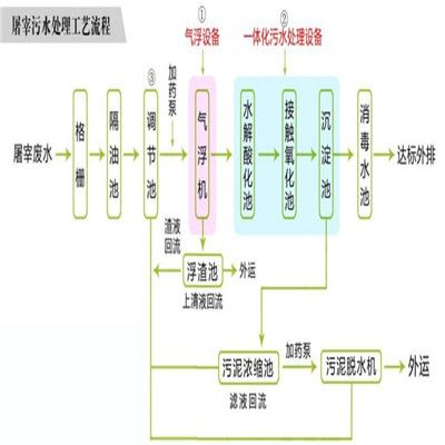 宰杀牛羊污水处理设备采用生物接触氧化处理工艺,比活性污泥池体积小,对水质的适应性强,耐冲击负荷性能好,出水水质稳定,不会产生污泥膨胀,产生的污泥量少;填料比表面积大,微生物易挂膜,脱膜,在同样有机物负荷条件下,对有机物去除率高,稳定可靠,同时无需投加药剂,节约后续成本,降低运行费用.水解酸化可有效分解大分子有机物,减少后续处理负荷,节省投入;沉淀效果理想,可获得较好的出水水质;消毒处理,去除率达到99.4%以上;妥善处理剩余污泥,保证系统的稳定可靠运行,排泥方便,减少人工操作;宰杀牛羊污水处理设备采用独特的构造方式,大限度的减少臭气扩散;运行管理简单,可根据实际情况进行运行状态调整,以获得合适的运行效果;净化BOD去除率在80%至90%之间,出水各项指标达到国家二级或一级排放标准.能够处理屠宰行业污水及其相类似的工业有机污水;